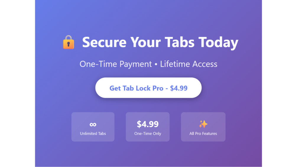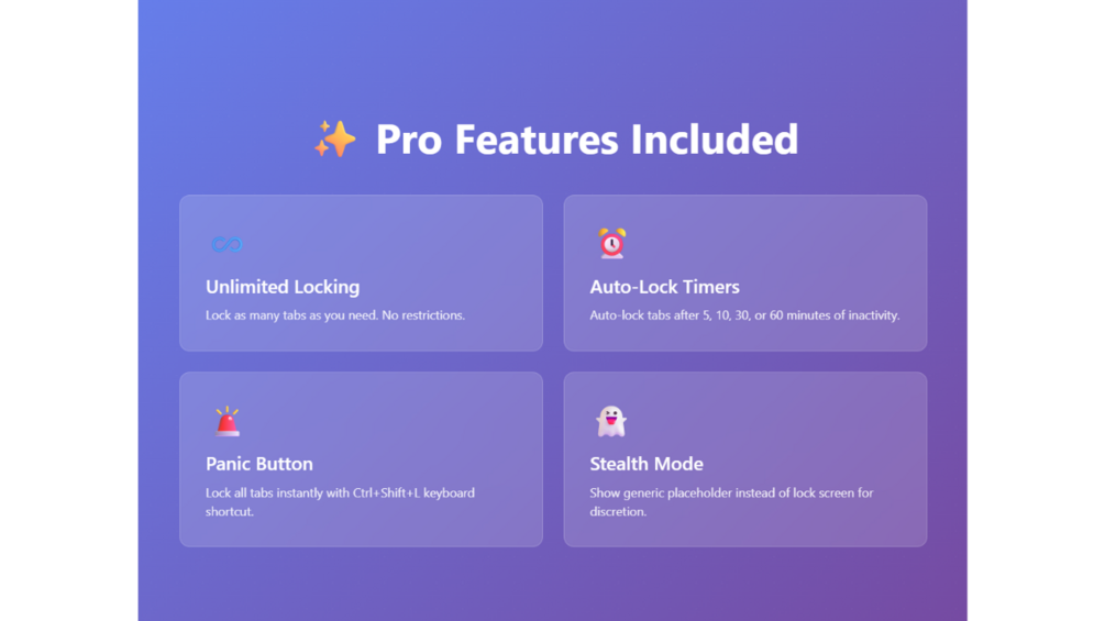 Unlock unlimited tab locking, auto-lock, stealth mode, panic button & more. One-time payment, lifetime access to all Pro features!