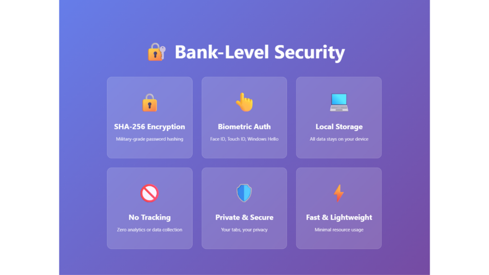 - Auto-lock after inactivity (5, 10, 30, or 60 minutes)